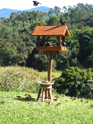 No começo deste ano a gente se mudou de novo - para uma cidadezinha no interior de São Paulo chamada Santo Antonio do Pinhal - e aqui recomecei com minhas experiências de alimentar os passarinhos da mata. Tive a sorte de encontrar um caseiro e uma caseira que são duas gracinhas - e ele fez para mim uma casinha para os passarinhos se alimentarem aqui no meu jardim. Isso é ótimo porque com um telhadinho a mistura de sementes se mantêm seca de um dia para o outro e também protege os meninos da chuva na hora da refeição.