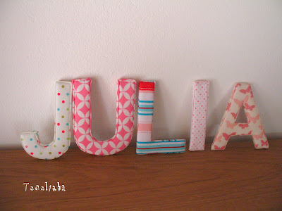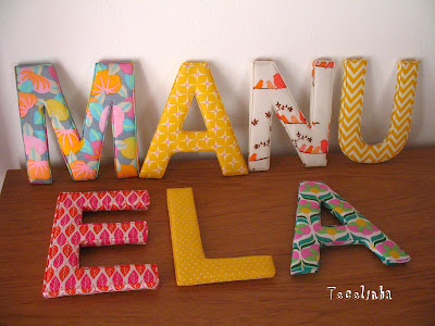 Antigamente eu fazia um modelo em tecido que chamava de miniquilt nos temas que as mães escolhessem e era muito bacana poder criar com os recortes de tecidos coloridos - e por causa da saudade deste tipo de trabalho tenho hoje estas duas opções, que podem ser feitas do jeitinho que cada cliente escolher: na forma de letras na vertical com enfeite ou na forma de quadro de 33 x 33 cm.