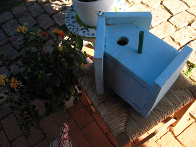 Usei nela tábuas de uma obra que os pedreiros largaram para trás, e minha serrinha tico-tico - devo dizer que não foi fácil, mas encaro a marcenaria e essas coisas de jardim como um hobbie mesmo, sem grandes espectativas, por isso apesar de ter ficado bem tosca (rss..) acho que pode funcionar! Quem sabe essas andorinhas que vejo se acomodando entre as telhas acabem adotando a casinha agora no inverno para criar seus filhotinhos? Não custa nada sonhar!