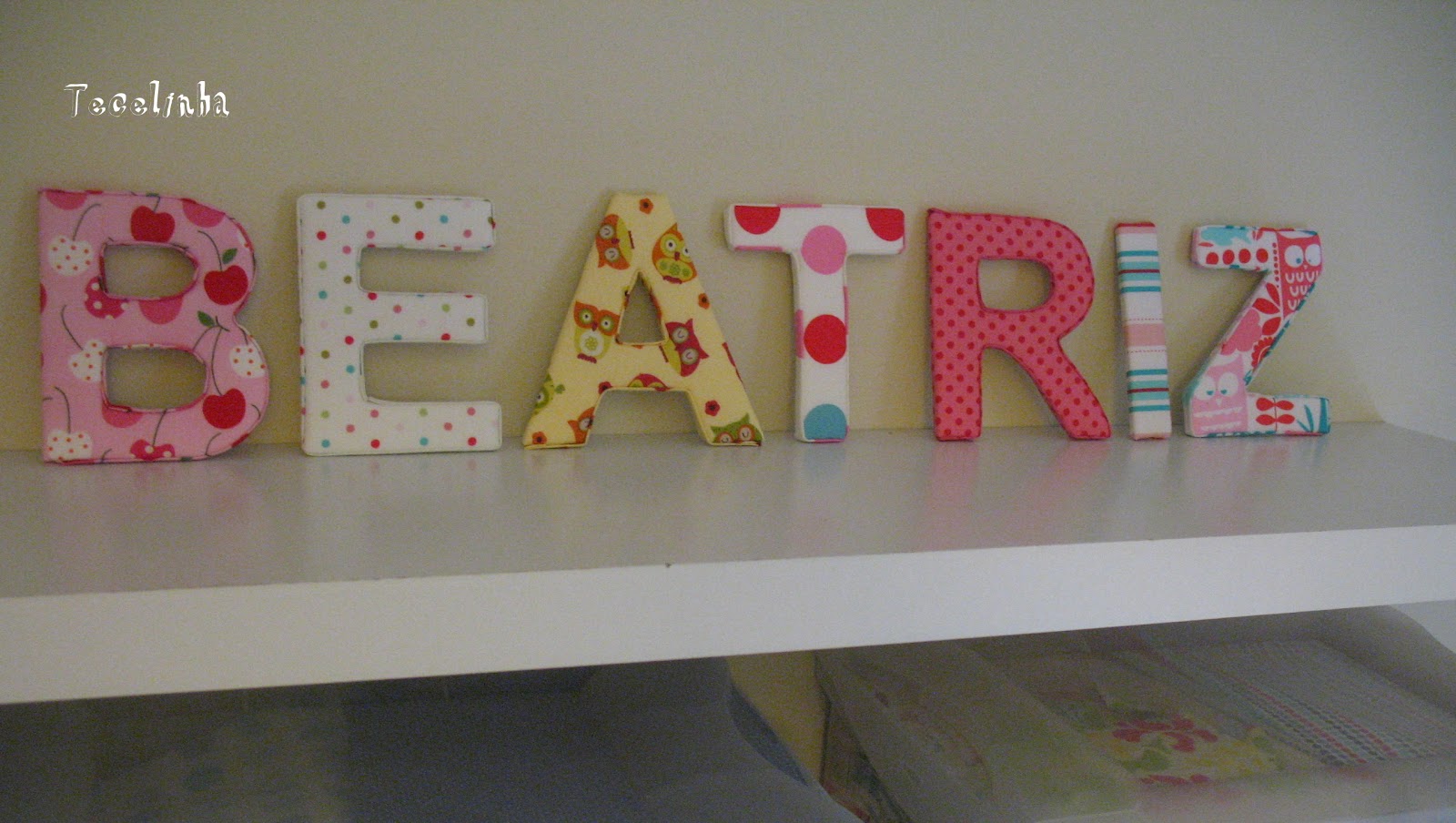 Antigamente eu fazia um modelo em tecido que chamava de miniquilt nos temas que as mães escolhessem e era muito bacana poder criar com os recortes de tecidos coloridos - e por causa da saudade deste tipo de trabalho tenho hoje estas duas opções, que podem ser feitas do jeitinho que cada cliente escolher: na forma de letras na vertical com enfeite ou na forma de quadro de 33 x 33 cm.